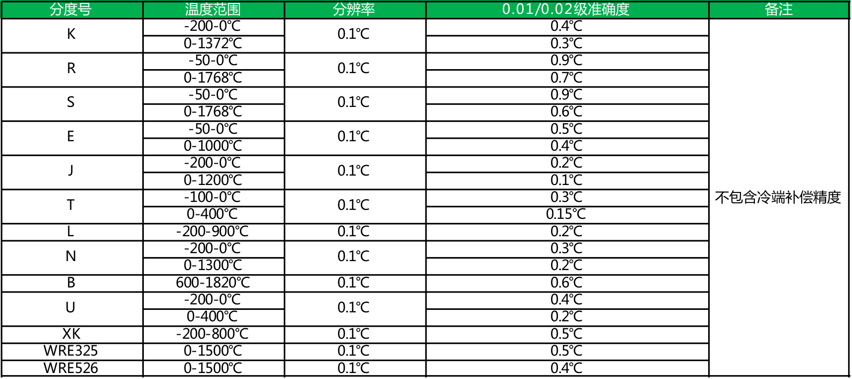 ● 热电偶种类:R,S,K,E,J,T,N,B,L,U,XK,WRE325,WRE526;