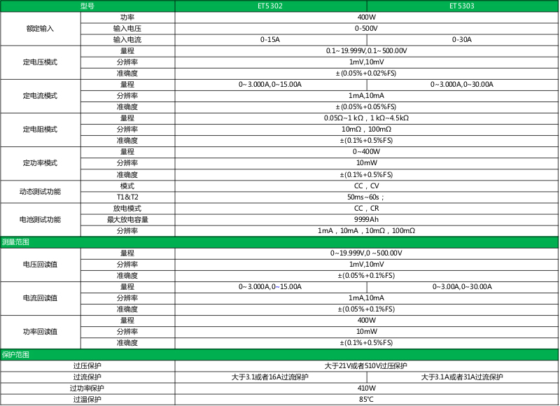 ET53系列单/双通道可编程直流电子负载,采用高性能芯片,高速,高精度设计,提供1mV、1mA的解析度,性能优越,可广泛运用于充电器,开关电源,线性电源,各类电池等行业的生产线测试,科研机构等试验研发领域。